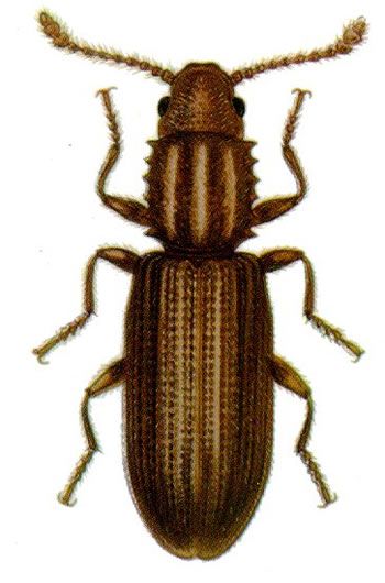 Ονομάζεται και οδοντωτό σκαθάρι των σπόρων, έχει λεπτό-πεπλατυσμένο και ευκίνητο σώμα μήκους 3 χιλιοστών. Μπορεί να ζήσει μέχρι και 2 χρόνια. Προσβάλει συνήθως σπόρους, σταφίδες αλλά και ψωμί, ζυμαρικά, μπισκότα, ξηρούς καρπούς, όσπρια, κακάο, καφέ κ.α.