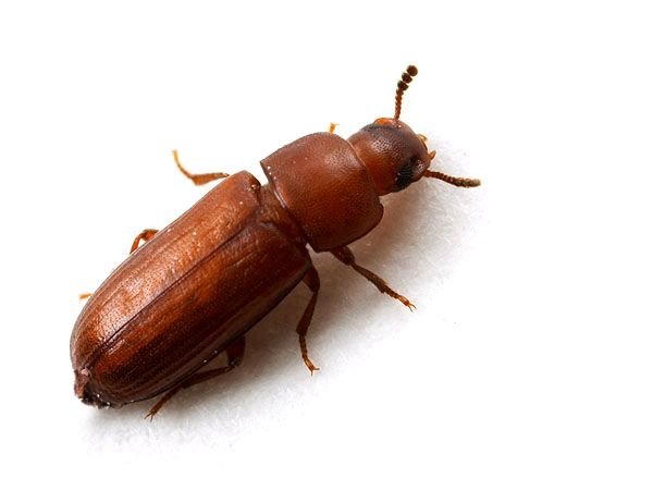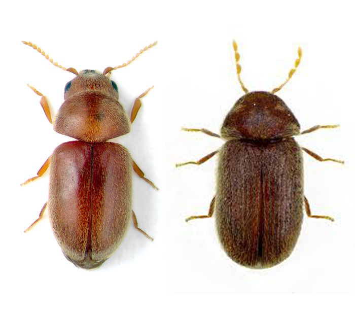 Αυτά τα δύο κολεόπτερα τα εμφανίζουμε μαζί λόγω των ομοιοτήτων τους. Είναι και τα δύο μικρά έντομα μήκους 2-3 χιλιοστά με δημιουργία 4 γενιών ανά έτος. Διαφέρουν στις κεραίες και σε μορφολογικά χαρακτηριστικά των ελύτρων και της κεφαλής τους. Έχουν τεράστια ποικιλία τροφικών προτιμήσεων όπως ζυμαρικά, κακάο, σοκολάτες, αρωματικά φυτά, αποξηραμένα φρούτα, ελαιώδεις σπόρους, όσπρια, χαρούπια, κ.α.